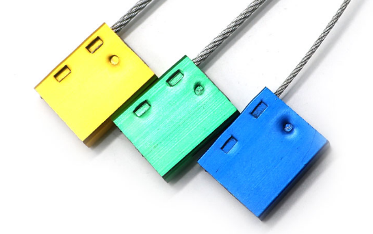 除了塑料外壳多见的就是铝合金外壳,铝合金钢丝封条外部包裹铝合金外壳,也是较为常见的一款钢丝封条产品,常被使用于集装箱周转车与厢式货车施封。它的外壳采用铝制材料,氧化喷涂后颜色鲜明。使用铝合金制材质在于能够有着较好的硬度,可以经受得住长时间运输途中的碰撞。而且铝合金钢丝封条 所使用的钢丝是直径较粗的 航空钢丝绳 ,抗拉强度强。